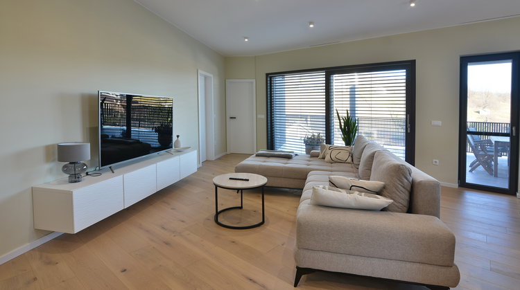 Tla v bivalnih in spalnih prostorih je hrastov parket, v predsobi, kopalnicah in terasi je keramika višjega cenovnega razreda. Sanitarni elementi so umivalniki, tuš kabine s pripadajočimi armaturami kvalitete Hans Grohe. Sanitarne školjke so s podometnim izplakovalnikom Geberit. Okna so troslojna AJM z zunanjimi žaluzijami na električni pogon. Notranja vrata s skritimi tečaji so z jedrom iz perforirane iverke. Vhodna vrata so v požarno-varni izvedbi EI30 s protivlomnim okovjem, samodejnim zapiralom in talno metlico. Ogrevanje prostorov je talno z individualno toplotno črpalko v inverter izvedbi z integriranim 180 l zalogovnikom sanitarne vode. Nameščen je sistem centralnega prezračevanja z rekuperacijo zraka proizvajalca System air. Vgrajena je klimatska naprava z dvema ventilatorskima konvektorjema na hladno vodo povezanim preko toplotne črpalke.